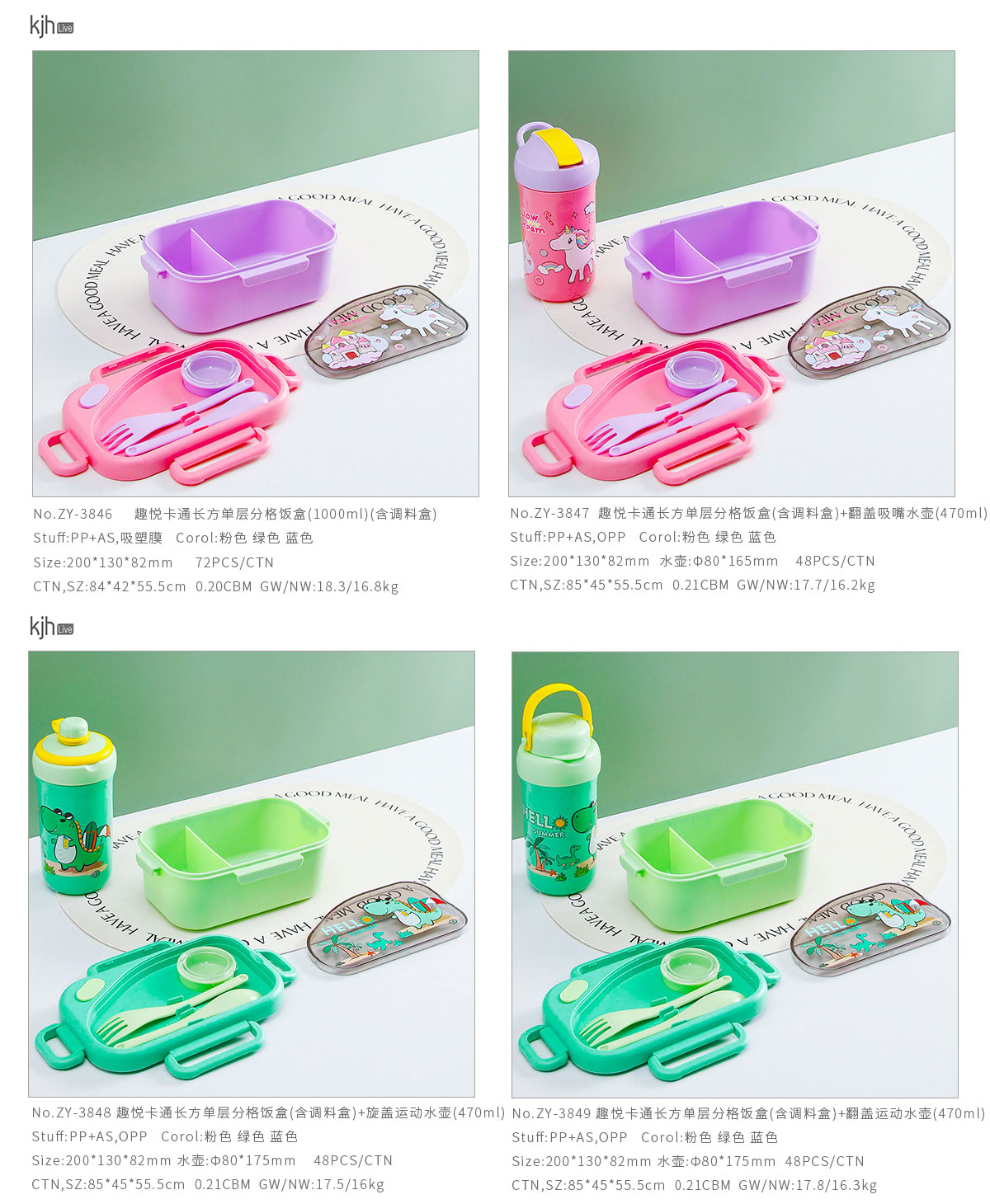 趣悅卡通長方單層/分格飯盒(含調料盒)+翻蓋吸嘴/旋蓋運動/翻蓋運動水壺