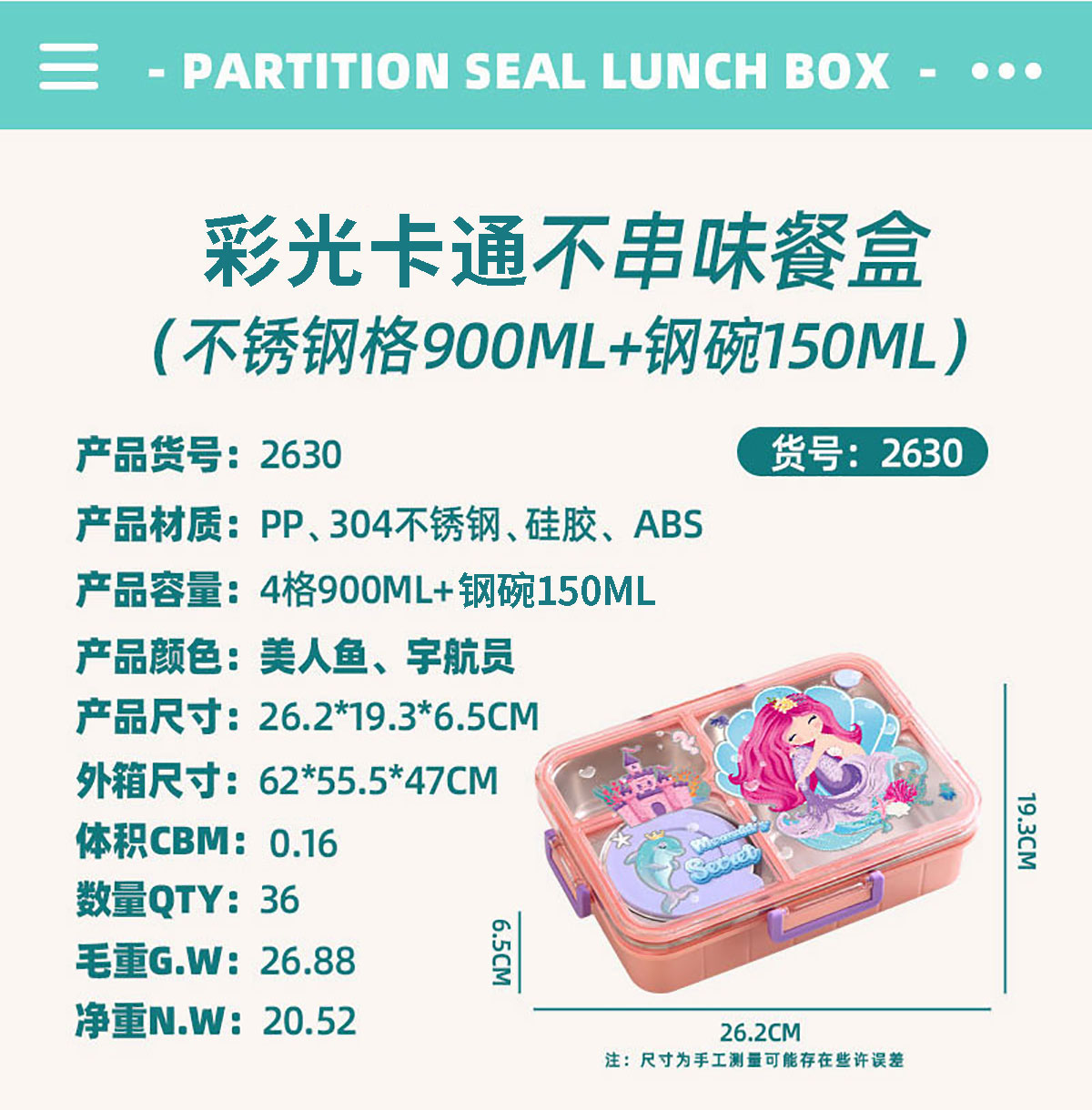 Size: AQX-2629:262*193*65mm/不銹鋼4格900ml+醬料杯80ml