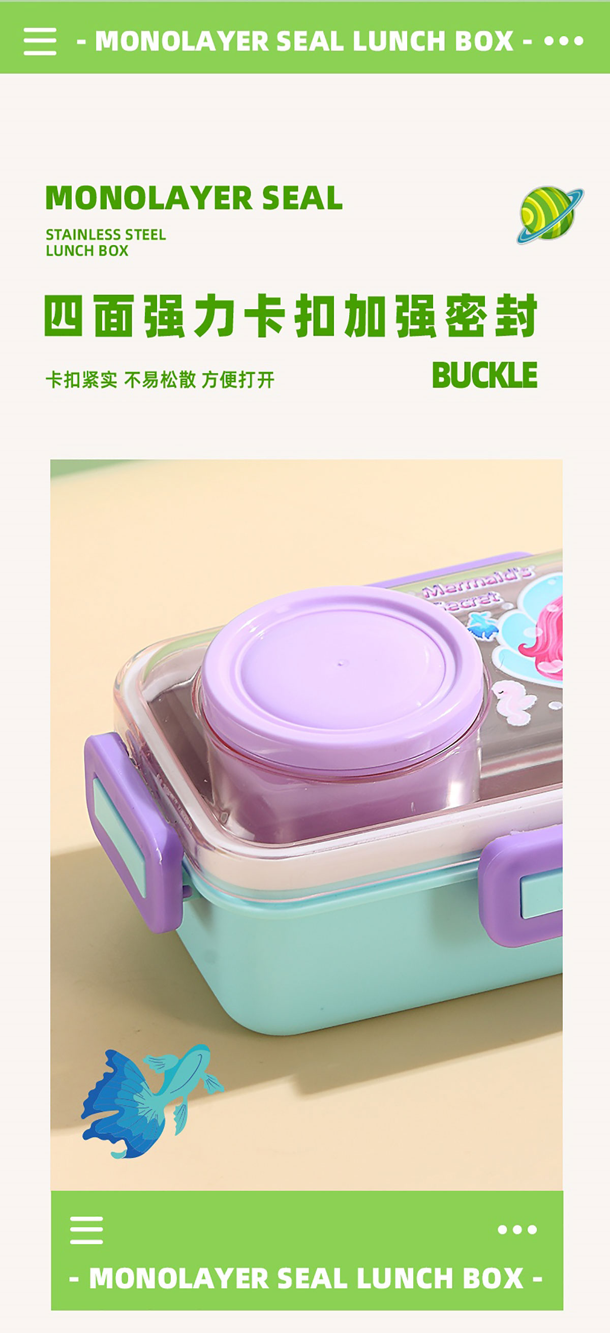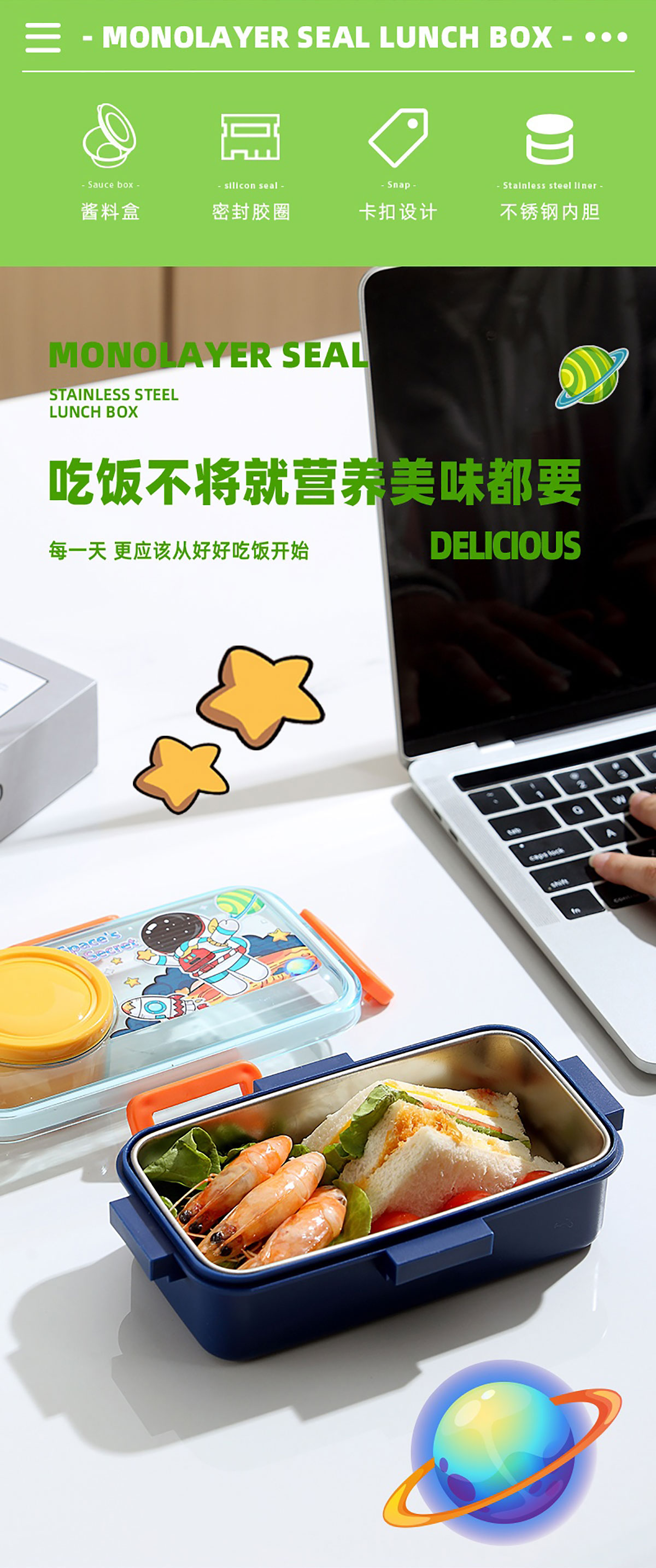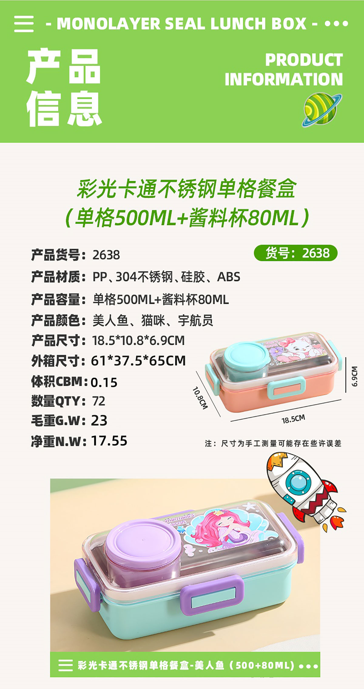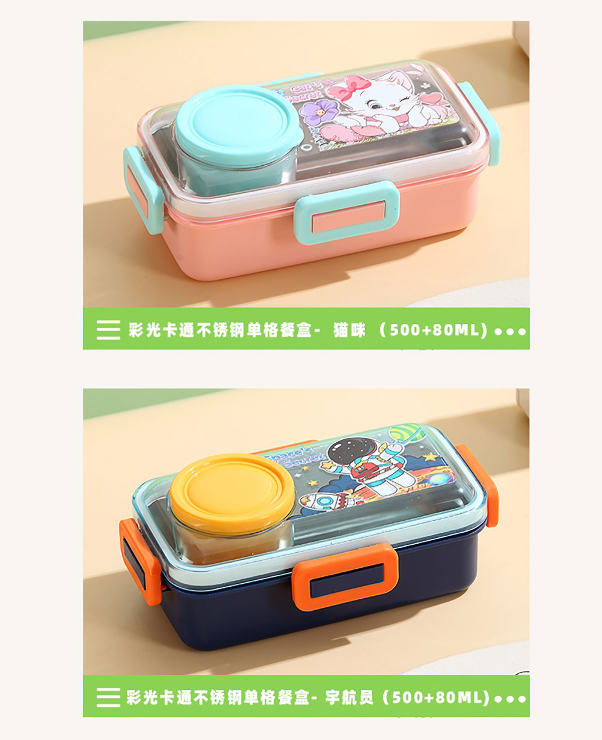 彩光卡通不銹鋼餐盒(單格500ml+外置醬料杯80ml)