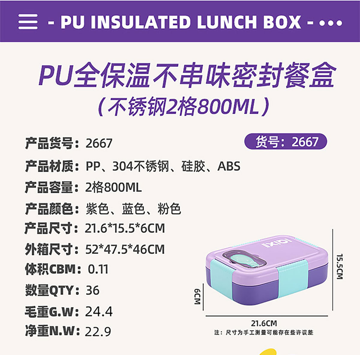 Size: AQX-2666(3格):216*155*60mm/750ml AQX-2667(2格):216*155*60mm/800ml